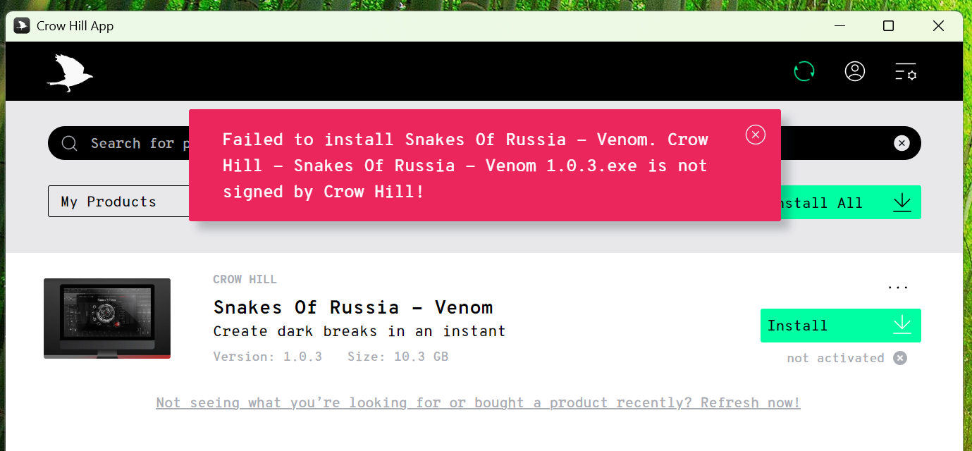 I just clean installed Win 11 and I am trying to install Venom but, the app gives me an error message that “Venom 1.0.3.exe is not signed by Crow Hill”.