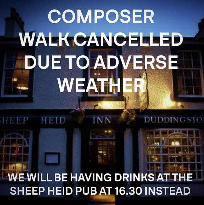 Weather warnings and high winds make this afternoon’s walk a bad idea. Let’s have a quiet pint in the Sheep’s Heid instead. Christian will be there from 16:30, card behind the bar, drinks on him!